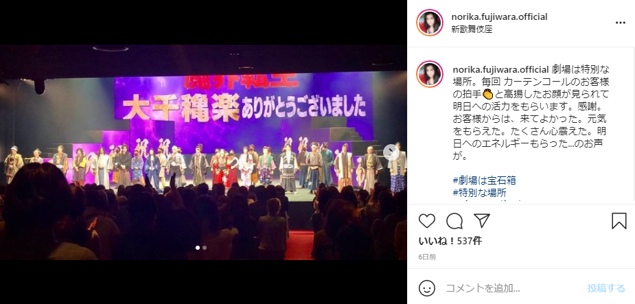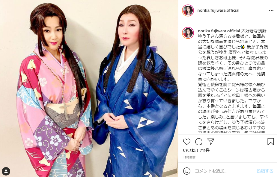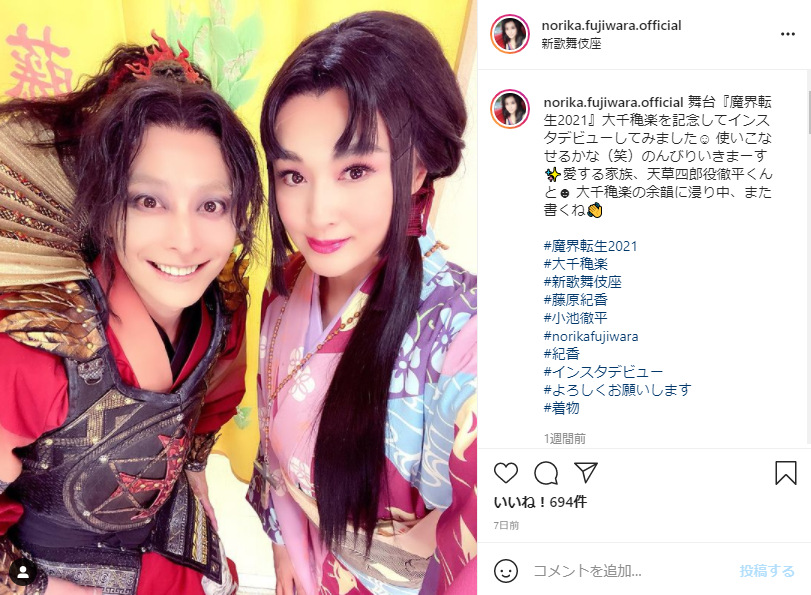 というコメントとともに公開されたのは、6月10日まで上演されていた舞台『魔界転生2021』の最終日に、姉弟の役を演じた俳優の小池徹平さん(35)と撮影したツーショット。派手でカラフルな着物を着た藤原さんの写真なのですが…。