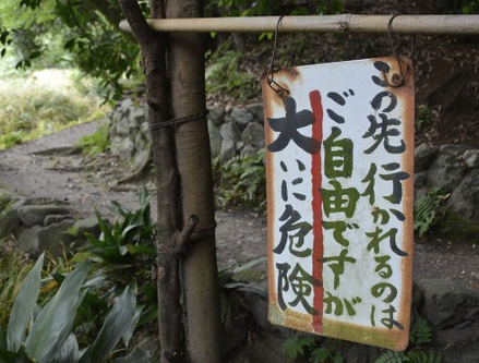 しかし、なぜそんな“怖い”看板を出しているのでしょうか。勧修寺の担当者によると、「池の周りにはカラスが多く、歩いている人の頭上に木の枝を落とすことがあります。池の周囲には柵がありませんし、歩道には木の根が張り出しています」とのことで、さまざまな危険が潜んでいるといいます。確かに、その歩道上には、この「大いに危険」の警告看板のほかにも、「この先カレエダ落下」という看板も設置されています。