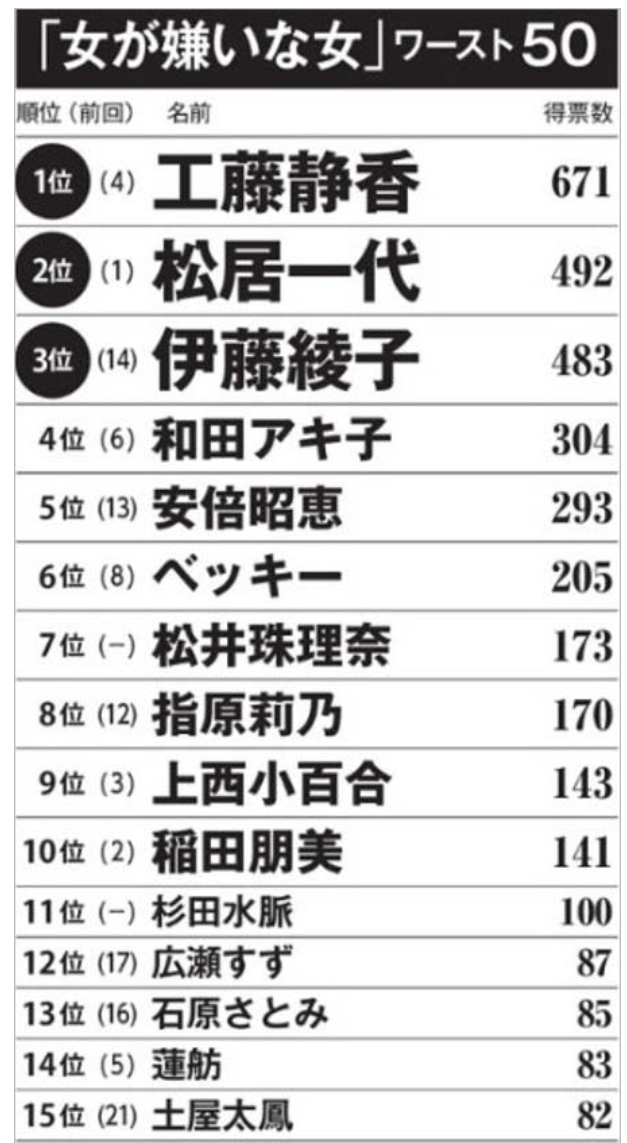 一方、週刊文春が毎年発表する、「女が嫌いな女」アンケートの結果、ランキングはこんな風になりました!