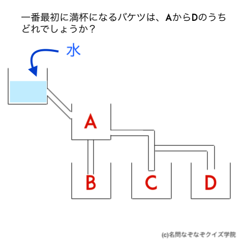 “一番最初に満杯になるバケツは、、、、?”よーく考えればすぐにわかる問題 今回ご紹介するのは脳トレクイズです。 問題 : 一番最初に満杯になるバケツは、AからDのうちどれでしょうか? Google ADVERTISEMENT Google あなたはわかりましたか? それでは答え合わせに行きましょう! Google 答えは、、、「A」 ADVERTISEMENT 図をよく見ると、Aより先の配管が全て塞がれています。そのため、「A」のバケツが一番最初に満杯になります。 ADVERTISEMENT Google あなたは間違えずに解けたでしょうか! Google [著作権者VONVON /無断コピー、無断転載および再配布禁止(違反時の法的措置)] ADVERTISEMENT