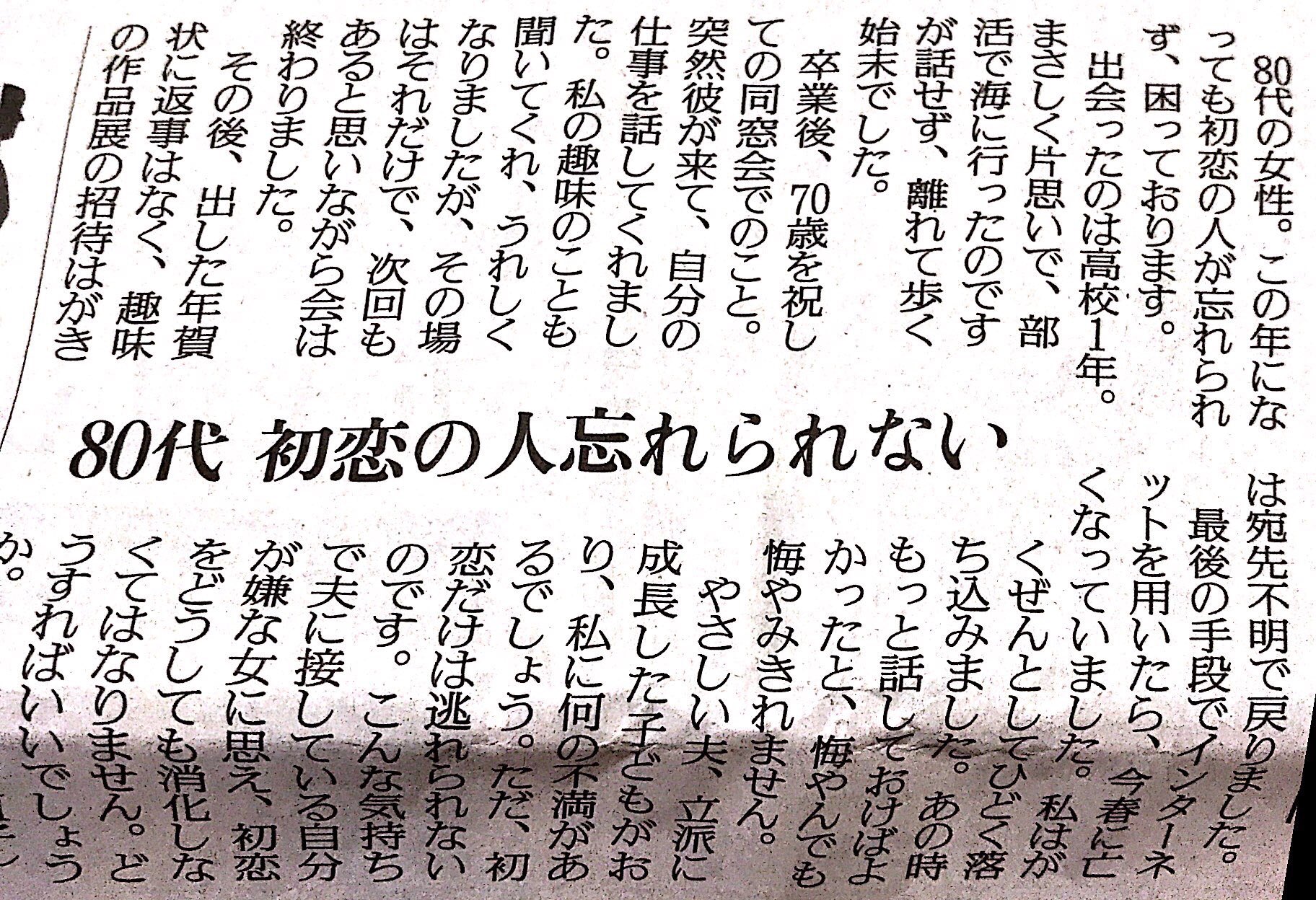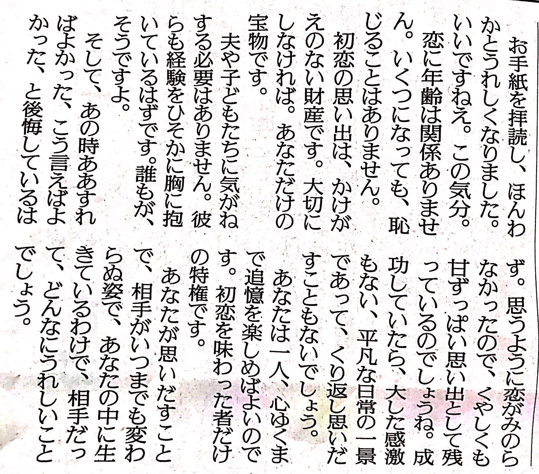 今日ご紹介するのは80代女性の初恋に関するお便りです。高校生の頃の初恋を何十年経った今も甘酸っぱい思い出として抱えているようなのですが、自分には家庭があるわけでこんな思いを抱えたまま家族と接するのは悪いことではないかと頭を悩ませているようです。