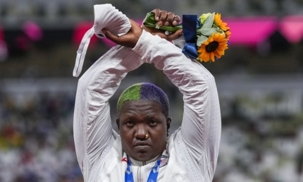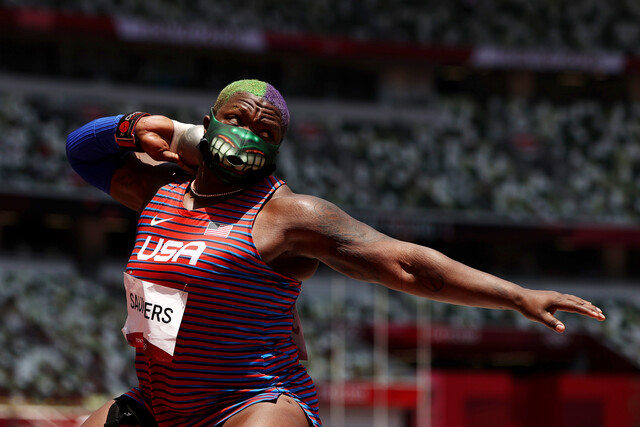 3日、外信などによると、アメリカ女子砲丸投げ銀メダリストのレーベン・ソーンダーズ選手が前日の表彰式で両手を交差させた「Xポーズ」を見せました。
