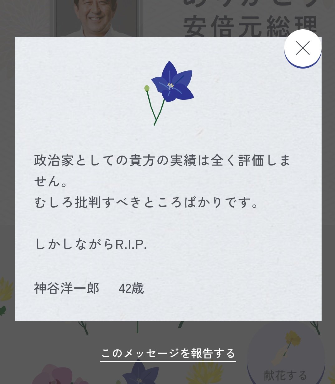 【適当に拾い読みしても癒される言葉ばかりでしたが遂にここにまで荒らしが。「負の遺産」は故人に送る弔意ではありません。御遺族に見せるとわかっていながら。運営に報告しましたが、皆さんも変なの見つけたら報告ご協力お願いします。献花終了まであと9日、ここだけは守りたいです】