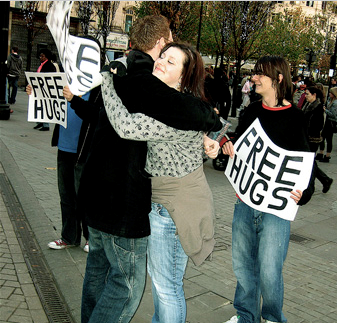 フリーハグとは、道行く人つまり見知らぬ人とハグをして人を励ましたり疲れた人の労を労うという意味で行われたパフォーマンスで、世界的に行われています。