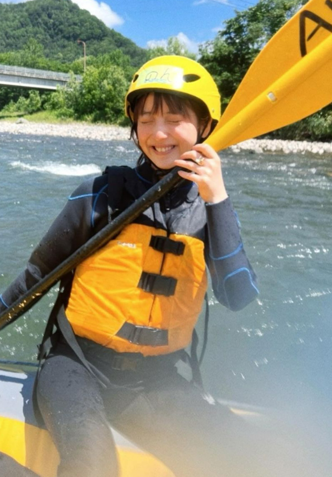 佐々木はヘルメットと救命胴衣を着け、その下にはタイトなダイビングのときに使うような黒いウエアを身に着け、川を下るゴムボートのへりに座り、オールを持って笑みを浮かべています。