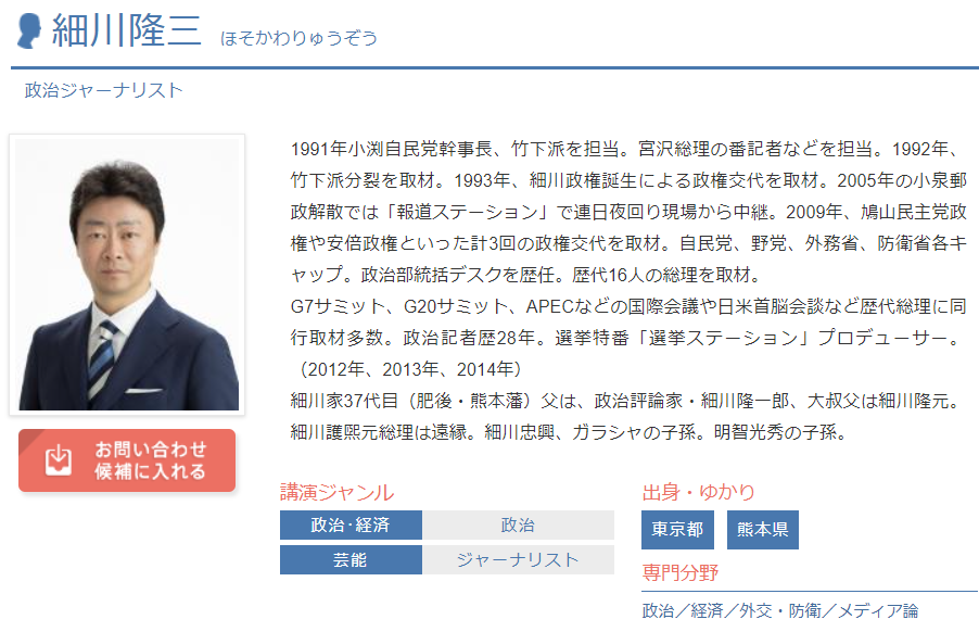 元テレビ朝日の政治部デスク出身の細川氏は、官邸キャップで歴代16人の首相を取材したという。