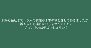 ”駅から会社まで、、、、” 頭を柔軟にして考えてみましょう 今回ご紹介するのは脳トレクイズです。 問題 駅から会社まで、5人の女性が1本の傘をさして歩きましたが、誰も少しも濡れたりしませんでした。 さて、それは何故でしょうか? Google ADVERTISEMENT Google あなたはわかりましたか? それでは答え合わせに行きましょう! Google 答えは、、、「雨が降っていなかったから。」 ADVERTISEMENT 傘は傘でも、日傘をさしていました。 Google あなたは間違えずに解けたでしょうか! Google [著作権者VONVON /無断コピー、無断転載および再配布禁止(違反時の法的措置)] ADVERTISEMENT