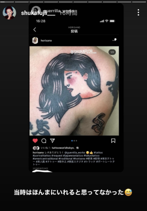 このやり取りがあった上での、今回のストーリーズの投稿。今村さんは19年8月に彫師のInstagramに投稿された自身のタトゥー写真を引用し、Instagramストーリーズで披露。タトゥーは藤井さんの横顔の写真を基にしたもので、「かわいいぜ」とメロメロなコメントを添えていました。