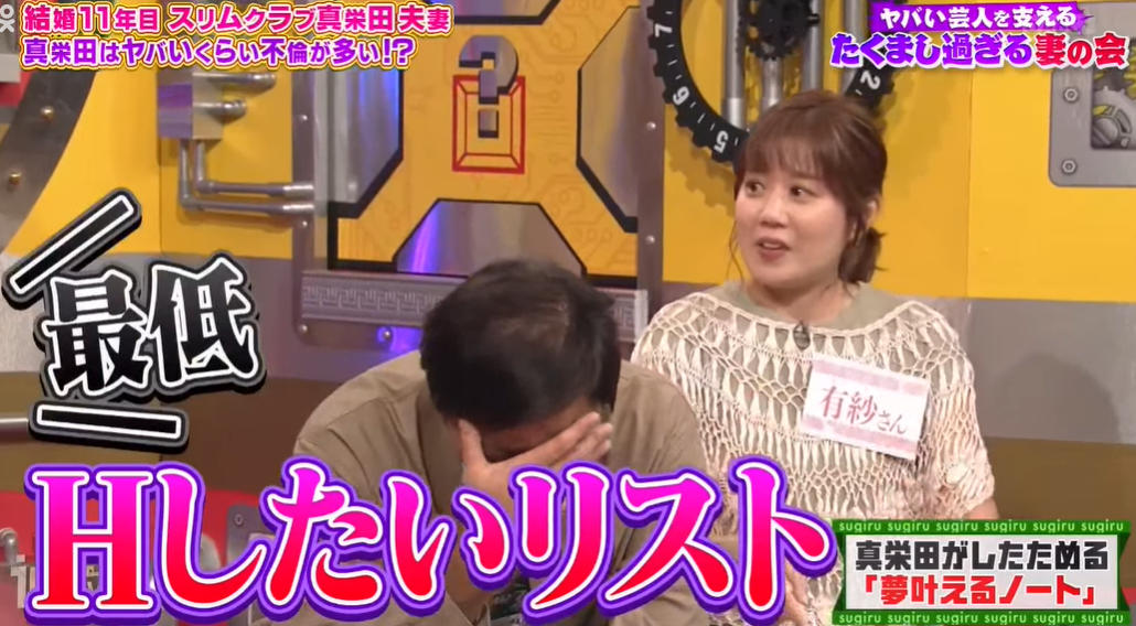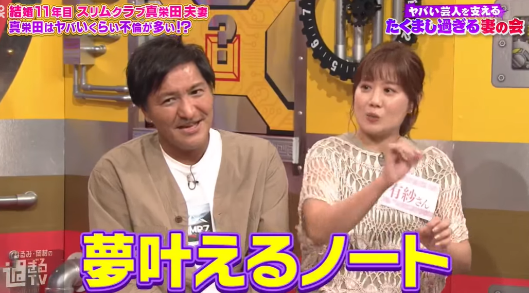 MCのナインティナイン・岡村隆史さんは「うわぁ‥‥ほんとなんでそれで不貞できるん?」と指摘。さらに、真栄田さんは「夢を叶えるノート」と称した、ネタや夢を書くノートに女性芸能人やアルバイト先の人の名前を書いて“行為をしたい女性リスト”を作成していたことを有紗さんから暴露される場面も。