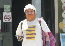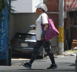 Tシャツには「鰹のたたき」のようなイラストがプリントされており、下は迷彩柄のスパッツを着用していました。