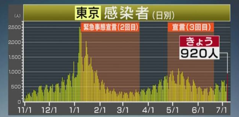 実際に東京都の現況を見てみると、7日発表の東京都新規感染者数は920人でした。900人超は5月13日以来とのことです。