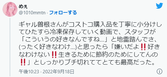 その光景を横で見守っていたスタッフが「こういうの好きなんですね」と問いかけました。すると、ギャル曾根は笑いながらも「嫌いだよ!!」と即座に返答し、「好きなわけない」と苦笑いをしていました。さらに、こういった小分け作業は食費の節約にかなり役立つことだとし、「節約して生きるためにやっている」と語っていました。