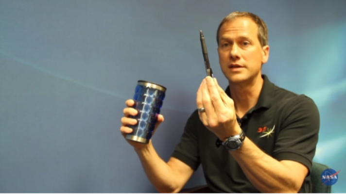 宇宙船ソユーズについて熱く語るマーシュバーンズ氏は、タンブラーを空中に置こうとすると床に落としてしまい、苦笑いして「ごめん」とつぶやいたマーシュバーン氏は、そう言ったそばからペンを落下。
