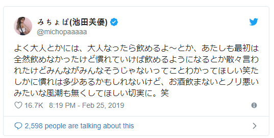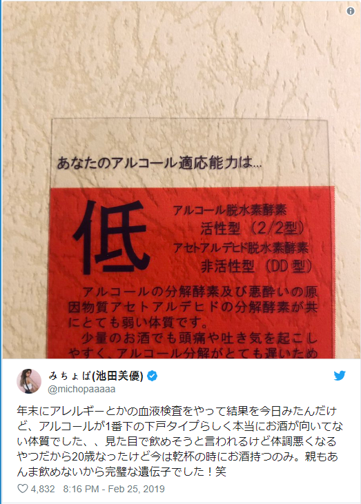 そうした考えに対して苦言を呈したのが、「みちょぱ」の愛称で知られる、ギャルモデルの池田美優さんです。2018年の年末に受けたアレルギー検査の結果をツイッターで公表し、アル〇ールが飲めない人や飲まない人への理解を求めました。