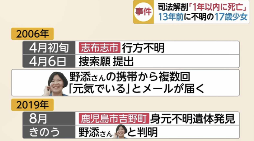 2006年から行方が分からなくなっていた野添希望さん(当時17歳)の一部白骨化した遺体が、鹿児島市の山林で見つかりました。8月に遺体が発見された後、死体遺棄容疑で捜査していた鹿児島県警は、9月25日に詳細を発表。法解剖の結果、死後数か月から1年程度であることがわかっていて、県警は不明後の約13年間の足取りを調べているとのことです。