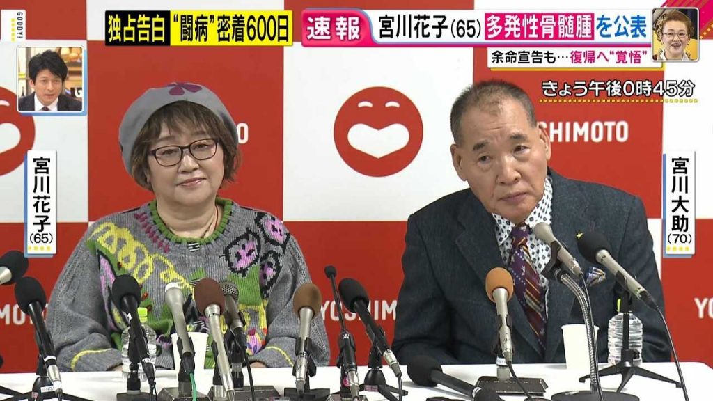 宮川花子さんは88年に胃がんを患い、宮川大助さんも脳出血などで休養を余儀なくされたことがありましたが、その都度克服し、舞台に復帰してきました。宮川大助さんは「一時は余命6カ月と言われ、漫才というより、女房の余命をどないして延ばしてやろうかと考えた。新しい薬も出て、効果も出ている。今は復帰にむけて、自力で動けるように社会復帰のリハビリをしている段階。日いちにちとよくなっている。」と話しました。