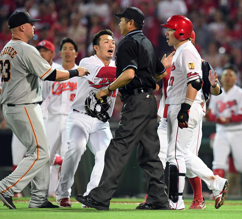 直後、死球を受けたアストゥディーヨ選手は、痛そうに片足をジャンプさせると、そのまま玉村投手のいるマウンドに向かって一目散に向かっていきました。しかし、アストゥディーヨ選手は直前で90度方向転換し、一塁へ行きます。あわや乱闘か、といった展開からの落差に、観客性からは笑い声も聞かれました。
