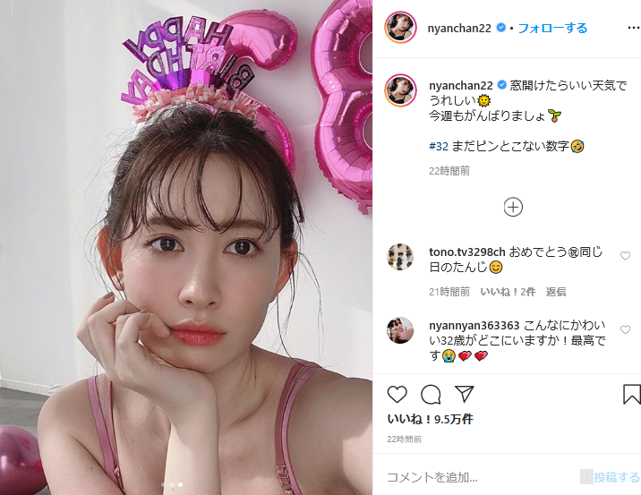 「にゃんちゃんに年齢はないですね」「32歳とは思えないかわいさ」「重ねるごとに美しつなるにゃん様…」「世界中の誰よりも美しい32歳だと思う」「眼福です」といった絶賛の声が殺到しているようでした。