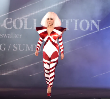 衣装のテーマは「ハイテク」。ピチッとした赤と白のボディスーツが際立った派手な衣装をまとい、高さが15センチのハイヒールを履いて華麗にランウエーを披露。