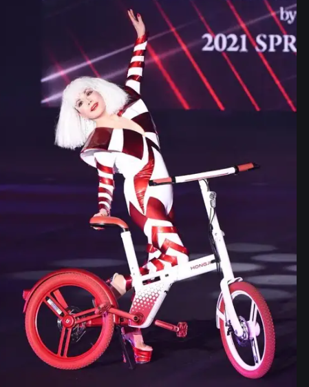 この日、HONGJI(ホンジー)電動アシスト自転車の公式アンバサダーに就任したことを記念し、近未来感あふれる斬新コスチュームを着て登場したデヴィ夫人。