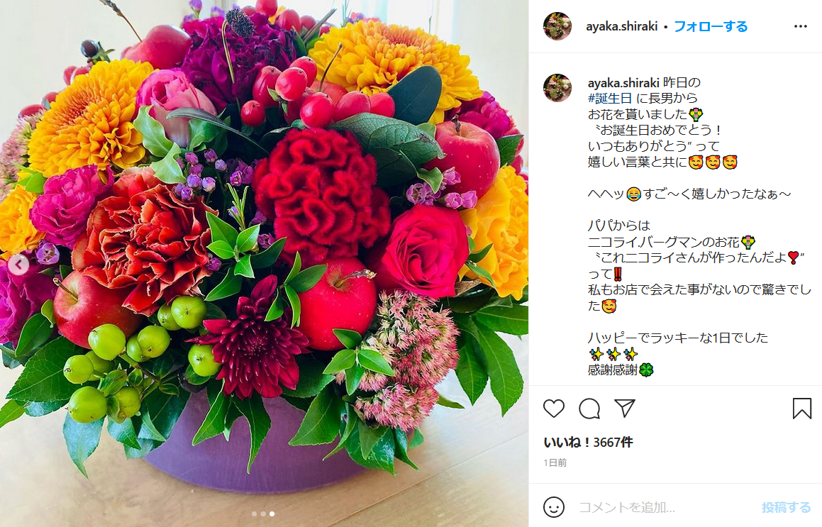 中山さんの妻・白城あやかさんは27日に54歳の誕生日を迎えたことをインスタグラムで報告しました。中山さんと長男からそれぞれお花のプレゼントを貰ったそうですよ。