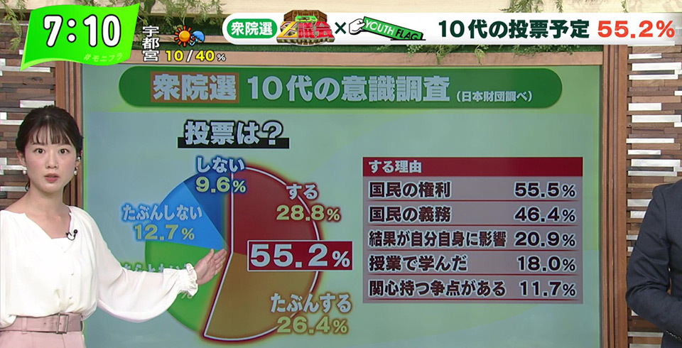 若者へのアンケートでは「面倒くさい」「どこに入れていいかわからないから行かない」などと話す意見を紹介したことに、池田さんは「面倒くさいのは分かるけど、言っても一瞬で終わるんで。(情報を)いろいろと調べたらいろいろ出てくる。今、ホームページも分かりやすく書いていたりする。テレビではやってなかったり、見なかったりするけど、ネットだと結構分かりやすく、若者の投票率を上げるべく寄り添ってくれていると思うので、ネットでちょっと調べるというか少しでもすれば。(リテラシーをもってないといけいないので)いろいろ調べて調べてって言うのはある」とコメントしたのでした。