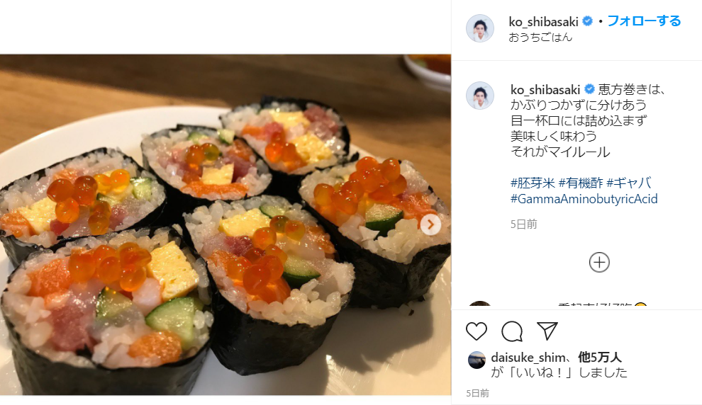 この日、柴咲さんは《恵方巻きは、かぶりつかずに分けあう 目一杯口には詰め込まず 美味しく味わう それがマイルール #胚芽米 #有機酢 #ギャバ #GammaAminobutyricAcid》とつづり、海鮮たっぷりの切り分けられた恵方巻の写真をアップ。