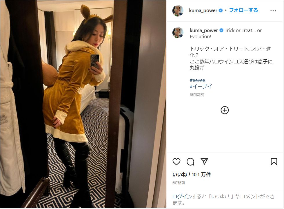 宇多田は、ポケットモンスターのキャラクター「イーブイ」を模したワンピースタイプのコスプレ衣装を着用した自撮り写真を投稿。イーブイのボディーカラーと同じ色のミニスカートで、しっぽ付き。耳カチューシャもバッチリ装着した宇多田は「ここ数年ハロウインコス選びは息子に丸投げ」と息子が選んだ衣装と明かしています。