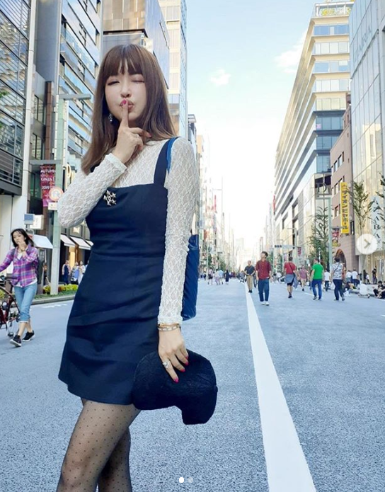 現在、48歳ながらワンピースはひざ上20センチほどあり、うすいブラックのタイツからは自慢の美脚がうかがえます。また、人差し指を唇の前に立てるポーズをしてみたりと、モデルらしい雰囲気がでた写真となっています。