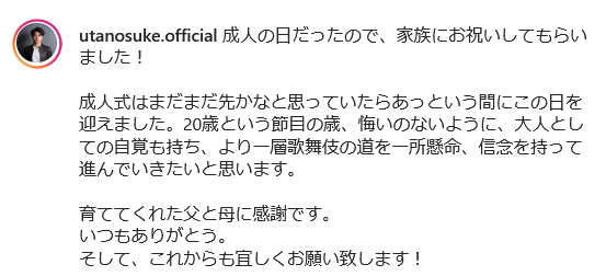 三男で歌舞伎俳優の中村歌之助さんはインスタグラムを更新し、家族揃って成人の日を祝ってもらったことを明かしました。両親に対して感謝の気持ちを綴っており、まっすぐ素直に成長した様子が見受けられます。