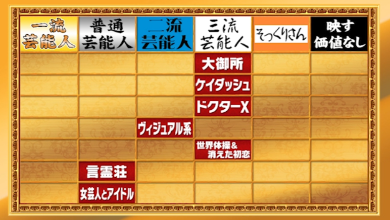大物芸能人たちが一チームを組み、味覚や音感など6つのジャンルの格付けチェックに挑む同番組。間違える度に一流→普通→二流→三流→そっくりさん、そして最後には“映す価値なし(画面から消滅)”とランクがどんどんダウンしていきます。