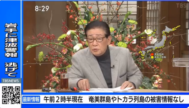 テレビ局関係者も「津波がやってくるという情報を常に流すことを視聴者に謝罪をするのはおかしい」と話した。 ほかのテレビ局同様に、TBSでも災害情報等がある場合は常に画面に掲示している。それを〝邪魔者扱い〟したのだから、局内からは怒りやあきれの声が出ていて、関係者も「災害などに臨機応変に対応して番組の進行をできない人が、司会を務めるのはいかがなものか。局内のあちこちから大ブーイングが起きている」と話します。