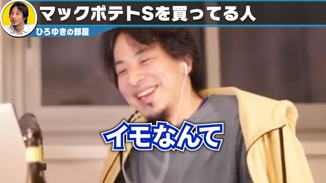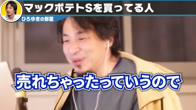 しかし、ひろゆきさんは自身のYouTube配信で、「ポテトSだけっていうので『ポテト食べたい!』って、売上が上がったわけじゃないですか」とコメント。さらに、「芋なんて、買おうと思えばいくらでも買えるんですよ」「ただ、高い国産の芋を買うのが嫌だからSだけにして。それがプロモーションになって売れたので、経営陣はウハウハ」と発言したのでした。