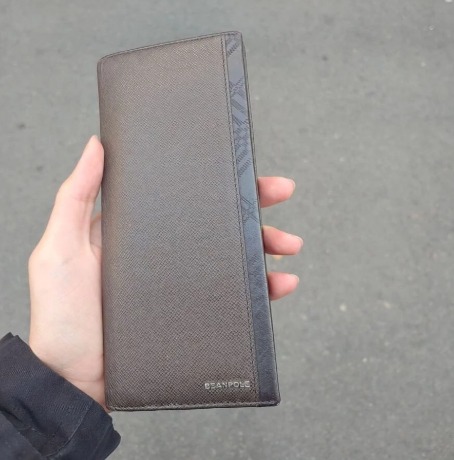 掲示物には、ある男性が路上で拾った財布を撮影した写真2枚が載っています。この大学生が習得した財布はBeanpoleというブランドの男性財布で、見た目ははたいして変わったところなどはない。