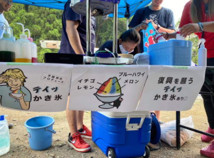 8月31日には人吉市と球磨村で手越さんが彩りなどを考え、手越さんの決めぜりふから取った「復興を願う テイッ! かき氷」約400食が被災者らに振る舞われました。