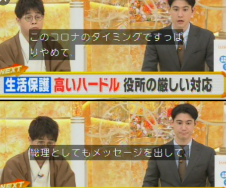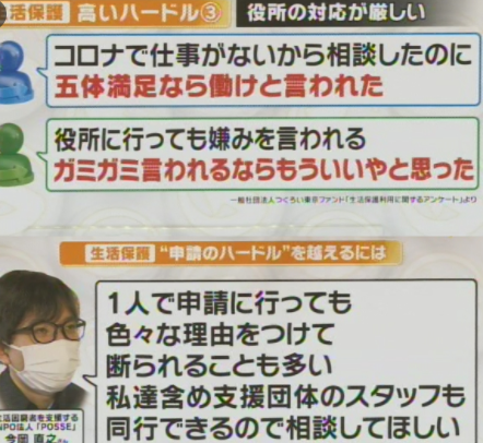 番組ではコロナ禍で仕事がなくなり生活保護で暮らしを立て直した中年男性と、同じくコロナで仕事が激減して生活保護を申請したのに断られたシングルマザーについて紹介。