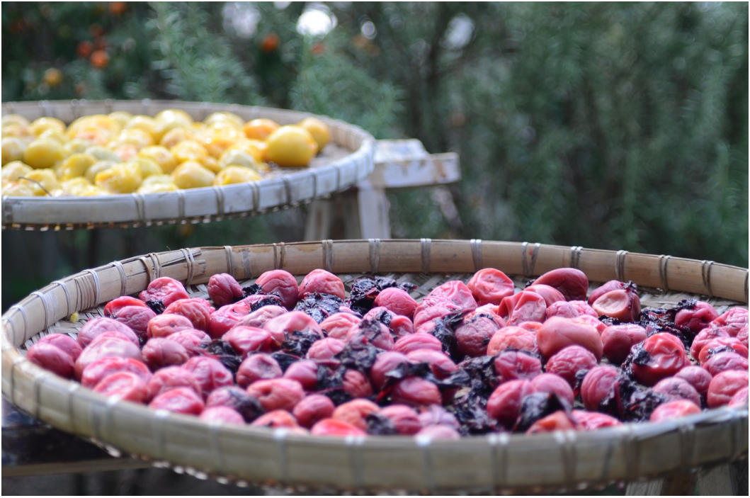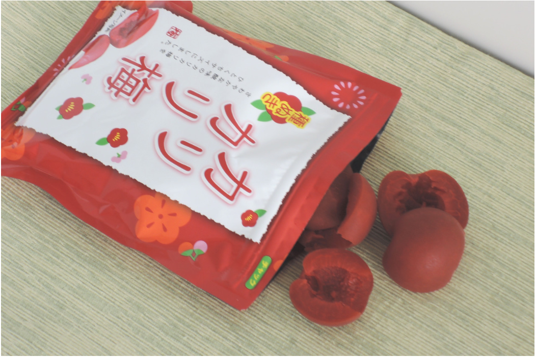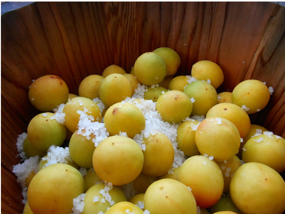 この梅を容器に入れ、ホワイトリカー(または焼酎)を少々振りかけて消毒します。そこに塩をかけて、ごしごしとしっかり強めに揉んでいきます。表面が緑色に透けてきたら、次にカルシウム分を足します。通常の梅干しは、梅の中のペクチンがペクチン酸カルシウムに変化し、それが水に溶けることで柔らかさが増していきます。カリカリ梅を作る際には、ここでカルシウムを足すことによって、梅が柔らかく変化せずに、青梅の固さをそのまま残るようになるのです。農家では昔、藁を燃やした灰を水に溶かしてそこにしばらく梅を漬け込み、その後にあらためて梅を漬けてカリカリ梅を作っていたそうです。カリカリ梅をはじめて商品化した会社は、この作り方にヒントを得て、カルシウムを用いる製法を確立したと言われています。