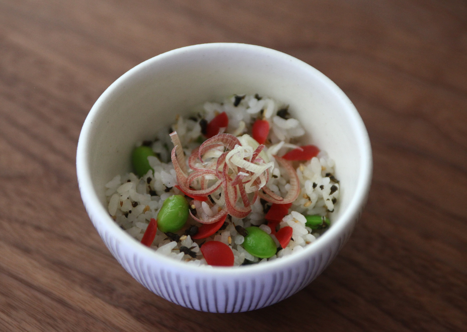もし市販のカリカリ梅のように赤い色を付けたい場合は、梅酢から引き上げる前に赤紫蘇を使います。赤紫蘇の20パーセントほどの塩を用意し、半量の塩で赤紫蘇を揉み込みます。黒みがかった水が出てくるので、それを絞ります。さらに残りの塩を入れ、再度揉み込んで出てきた水を絞って捨てます。揉み込んだ赤紫蘇に少量の梅酢を加えてほぐしていくと、鮮やかな赤に色が変わっていきます。これをカリカリ梅を漬けた容器に一緒に入れ、またしばらく漬けておくと、赤紫蘇の色に梅が染まって、きれいな赤い色のカリカリ梅ができます。