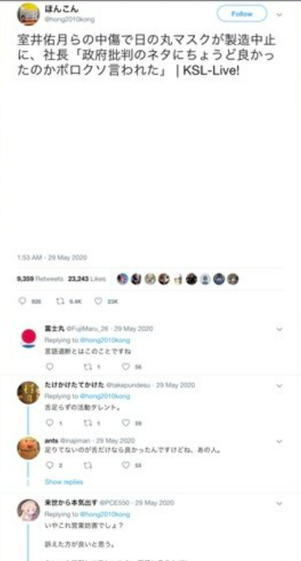 しかしほんこんがこれに反応し、「室井佑月らの中傷で日の丸マスクが製造中止に」と題するネット記事を、タイトルとともにツイッターで拡散したのです。さらに「何故こんな事を」などの感想もツイート。