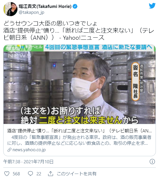 協力しない店と取引停止を・・・酒の販売事業者に要請へ(2021年7月8日)