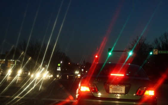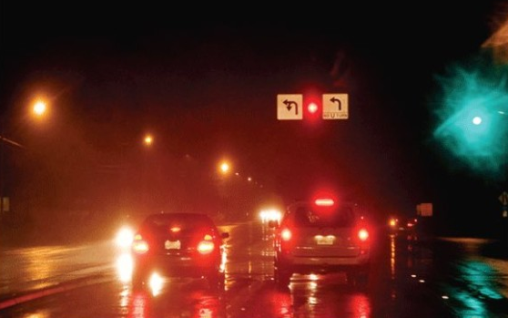 まず、乱視ではない人の目には、夜の世界はこのように見えます。道路上の赤信号で停止している自動車が、このようなビジョンで見えるのです!自動車のバックライトや、信号機が赤く光って見えます。
