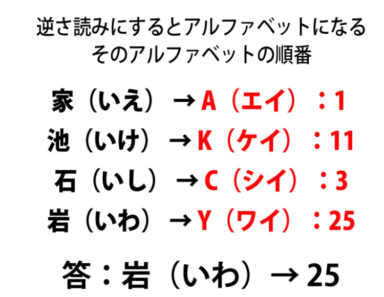 答えは、、、まず「いえ」を逆読みにして「えい(エイ)」。これをアルファベットに変換して「A」。アルファベットの順番に数えると “1” になる。これに基づくと、池は「K」だから “11”。石は「C」で “3”。