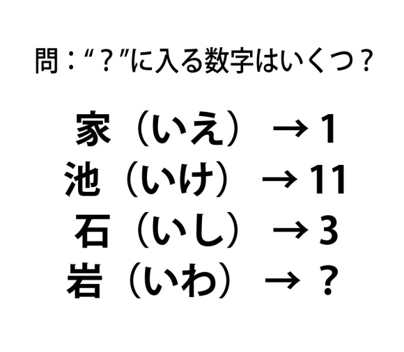 問題 :「家 → 1 池 → 11 石 → 3」では『岩』はいくつ?