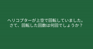”回転した回数は何回でしょうか?” 頭が柔軟な人には10秒で解ける簡単クイズ問題! 今回ご紹介するのは脳トレクイズです。 問題 ヘリコプターが上空で回転していました。 さて、回転した回数は何回でしょうか? Google ADVERTISEMENT Google あなたはわかりましたか? それでは答え合わせに行きましょう! Google 答えは、、、「千回」 ADVERTISEMENT ヘリコプターが回転することを「旋回」と言います。旋回だけに、「千回」回転しました。 Google あなたは間違えずに解けたでしょうか! ADVERTISEMENT Google [著作権者VONVON /無断コピー、無断転載および再配布禁止(違反時の法的措置)