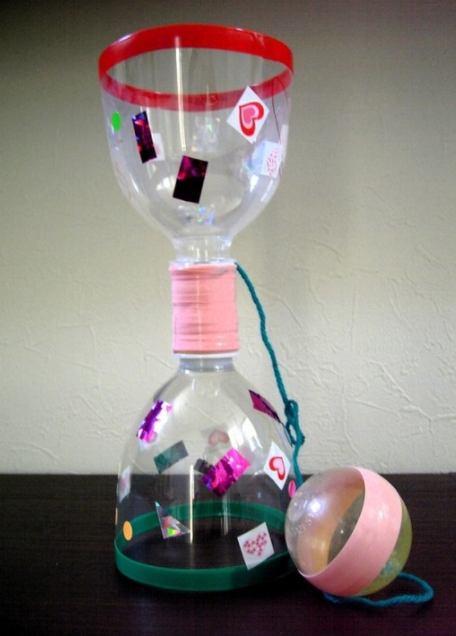 おもちゃの4つ目はけん玉を紹介。赤ちゃん用のけん玉は、ペットボトルを半分の所で切り離して、ビニールテープで切り口を保護します。キャップにひもを取り付けて、その先に柔らかいスポンジ製のボールや、軽いコットンなどでボールを形作ったモノを取り付けます。ボールを振り子風にゆすって、ペットボトルの受け皿に入れることが出来たら拍手!3歳から5歳の幼児には、もう少し高度なけん玉を作りましょう。ペットボトルを2つ準備して、口の部分から同じ長さの所で切り離します。切り離した口の部分は、けが防止に必ずビニールテープでしっかり保護をします。けん玉の玉はキャップを利用します。キャップとキャップを内側どおしにテープでくっつけます。この時にタコ糸を中に挟んでからしっかりテープで取り付けることをおわすれなく。じょうごのように作ったペットボトルの方を、けん玉の玉を付けたタコ糸を両方の口が合わさるところに挟み込んで、しっかりとテープで固定します。軽いペットボトルですが、振ったひょうしに外れては危険ですので、何重にもしっかりとテープで巻きつけて固定してください。