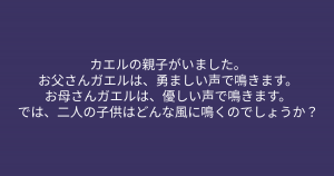”どんな風に鳴くのでしょうか?”みなさんは分かりましたか? 今回ご紹介するのは脳トレクイズです。 問題 カエルの親子がいました。 お父さんガエルは、勇ましい声で鳴きます。 お母さんガエルは、優しい声で鳴きます。 では、二人の子供はどんな風に鳴くのでしょうか? Google ADVERTISEMENT Google あなたはわかりましたか? それでは答え合わせに行きましょう! Google 答えは、、、「鳴かない」 ADVERTISEMENT カエルの子は「おたまじゃくし」のため、鳴くことはありません。 Google あなたは間違えずに解けたでしょうか! ADVERTISEMENT Google [著作権者VONVON /無断コピー、無断転載および再配布禁止(違反時の法的措置)]