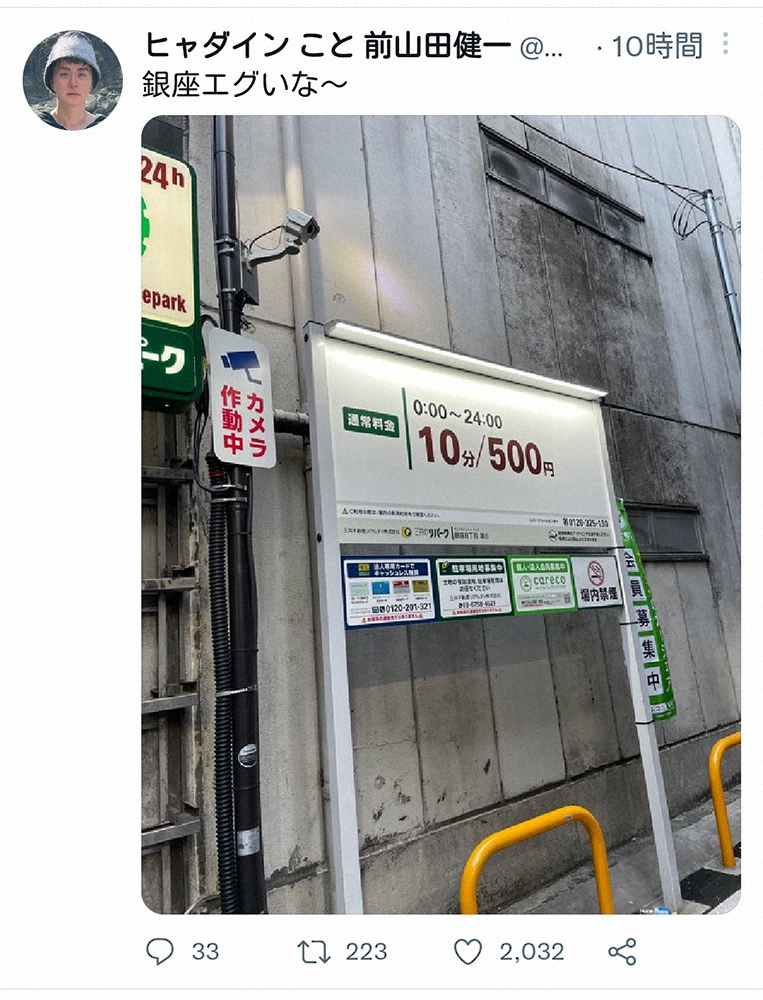 音楽クリエーターのヒャダインこと前山田健一が、自身のツイッターを更新しました。銀座のコインパーキングの料金表を見て「銀座エグいな~」とつぶやきファンからもコメントが寄せられ話題になりました。