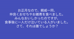 ”親戚一同、仲良くおせちやお雑煮を食べました。” 問題文をよく読まないと解けないクイズ問題 今回ご紹介するのは脳トレクイズです。 問題 お正月なので、親戚一同、仲良くおせちやお雑煮を食べました。 みんなおいしかったのですが、食事後に一人だけ泣いている人がいました。 さて、それは誰でしょうか? Google ADVERTISEMENT Google あなたはわかりましたか? それでは答え合わせに行きましょう! Google 答えは、、、「甥」 ADVERTISEMENT 問題文に「みんなおいしかった」とあります。「皆、甥叱った」ので、「甥」は泣き出しました。 Google ADVERTISEMENT あなたは間違えずに解けたでしょうか! Google [著作権者VONVON /無断コピー、無断転載および再配布禁止(違反時の法的措置) ADVERTISEMENT