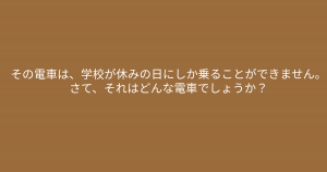 ”学校が休みの日にしか乗ることが、、、” あなたに解くことができますか? 今回ご紹介するのは脳トレクイズです。 問題 その電車は、学校が休みの日にしか乗ることができません。 さて、それはどんな電車でしょうか? Google ADVERTISEMENT Google あなたはわかりましたか? それでは答え合わせに行きましょう! Google 答えは、、、「急行電車(休校電車)」 ADVERTISEMENT 学校が休みということは、「休校」しているということです。休校だけに、「急行電車(休校電車)」が答えになります。 ADVERTISEMENT Google あなたは間違えずに解けたでしょうか! Google [著作権者VONVON /無断コピー、無断転載および再配布禁止(違反時の法的措置)] ADVERTISEMENT
