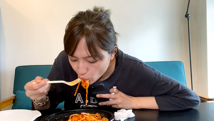 川口さんは肘をつきながら豪快にパスタを〝ズズズッ〟とすする食べ方を連発!
